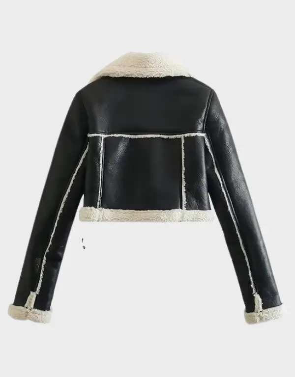 The cropped, slim-fit silhouette flatters your shape while adding a modern edge to the classic aviator jacket. A wide lapel faux fur collar and cream shearling trim create striking contrast against the black leather, elevating both casual and dressed-up outfits. Finished with a front fold-over closure, full-length sleeves with cuff detailing, and handmade construction, each jacket is individually crafted for premium quality.