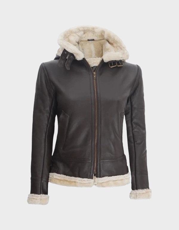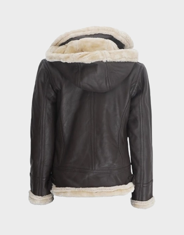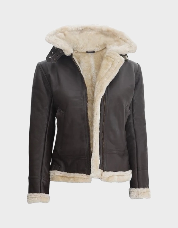 Women’s Dark Brown Shearling Leather Jacket with Hood